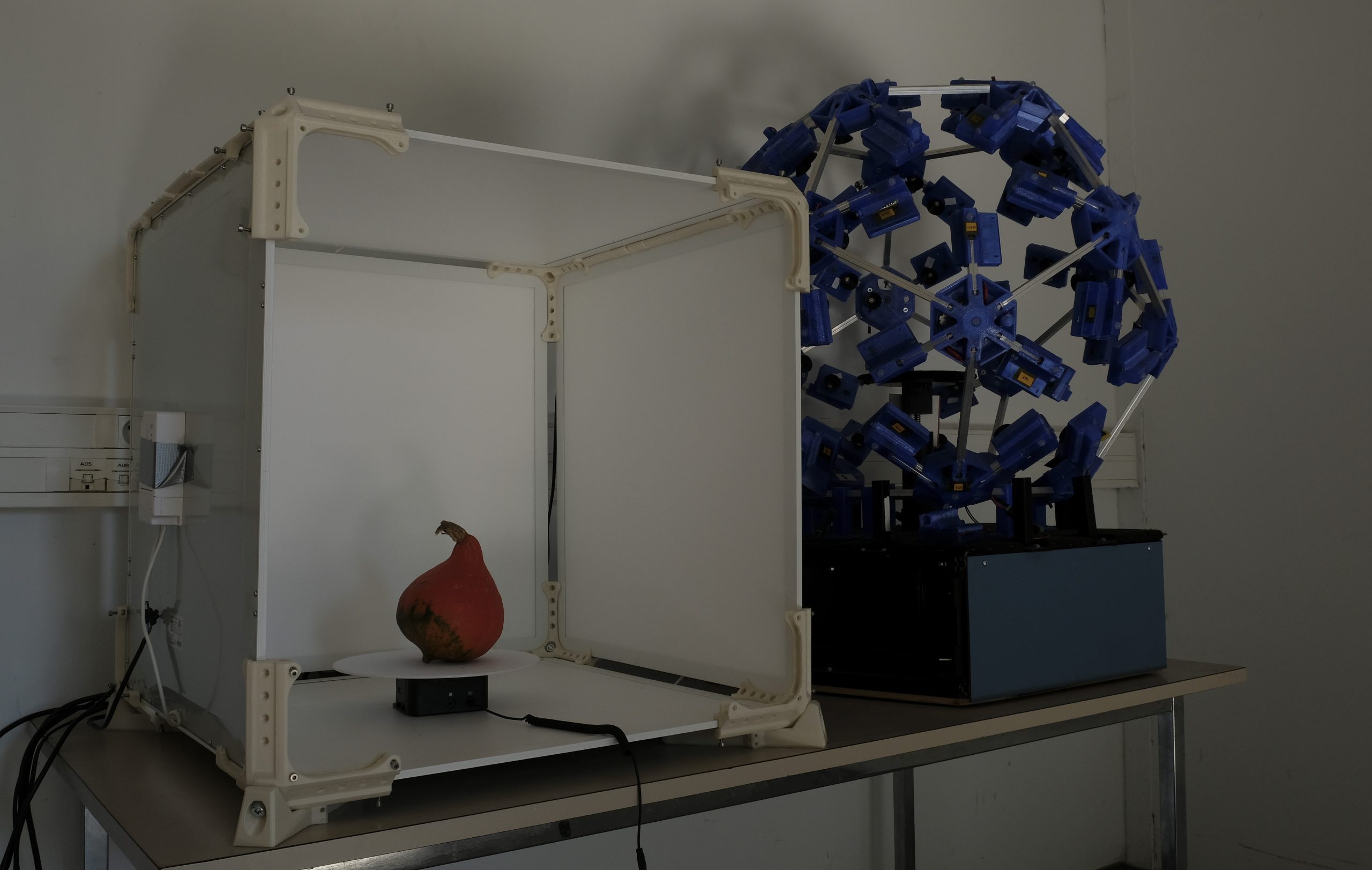 Description : boîte à lumière en open-hardware composée de dalles LEDS et de pièces imprimées en 3D couplée avec une table tournante automatisée