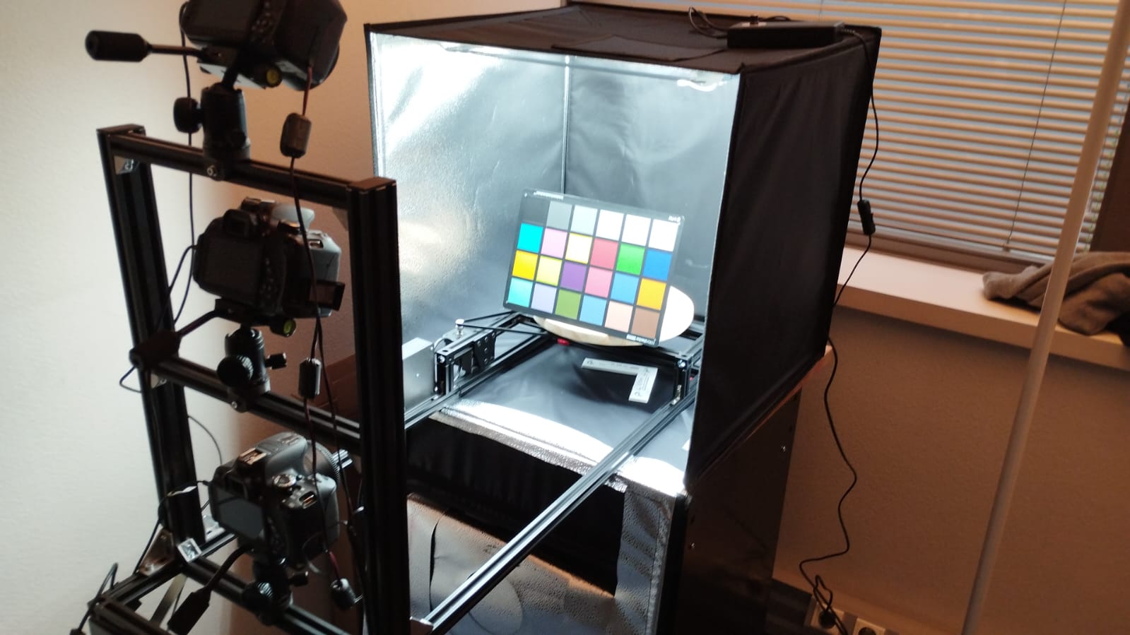 Description : 4 appareils photos et des bandes lumineuses LED pour un éclairage uniforme de l’objet et un plateau tournant au milieu, fixé sur des rails