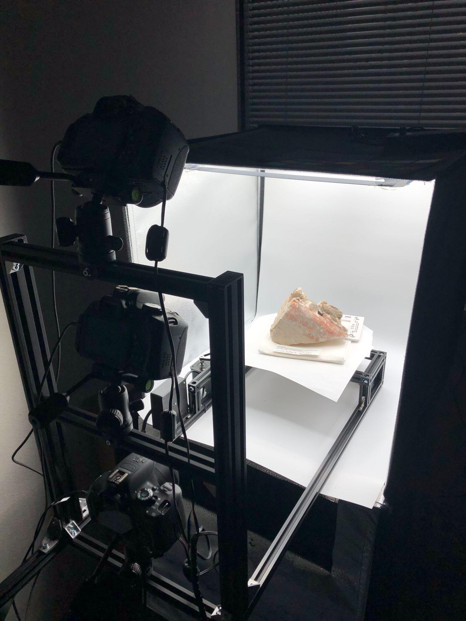 Description : boîte à lumière associée à une structure de 3 caméras orientables couplée avec une table tournante automatisée